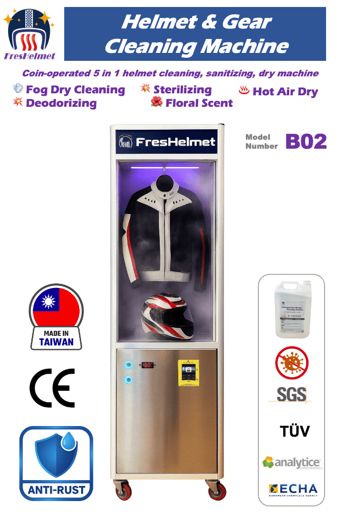 安全帽洗烘機採用煙霧低溫蒸氣輕乾洗,並融合零死角霧化型抗菌除臭清潔液,將消毒的微粒分子附著於內襯與透氣孔裡,不只除菌還除臭呢!